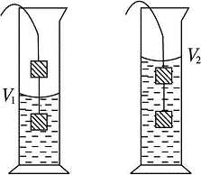 (2)压入法和沉坠法:形状不规则、不溶于水而在水中又不能下沉的固体适用于此方法.压入法是指物体漂在水面上时,可使用一细长钢针(或其他细长物体)将它压入到浸没在水中,即可测出物体体积;沉坠法是指不能在水中下沉的物体,可在其下面悬挂一密度大的物体(例如铁块),如下图所示,分别读出铁块浸没时水面所指刻度V1和物体与铁块一起浸没到水中的刻度V2,则物体体积为V=V2-V1.