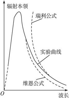 19世纪末,人们从实验和理论两个方面研究了各种温度下的黑体辐射,测量了黑体的辐射强度按波长分布情况,得出如图17-1-3所示的实验曲线.