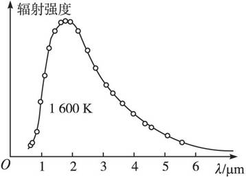 (3)热辐射现象:通过实验观察热辐射现象,可以发现热辐射的光谱是连续光谱,并且辐射光谱的性质与温度有关.在室温下,大多数物体辐射不可见的红外线.但当物体被加热到500 ℃左右时,开始发出暗红色的可见光.随着温度的不断上升,辉光逐渐亮起来,而且波长较短的辐射越来越多.大约在1 500 ℃时就变成明亮的白炽光.这说明同一物体在一定温度下所辐射的能量,在不同光谱区域的分布是不均匀的,而且温度越高光谱中与能量最大的辐射相对应的频率也越高.
